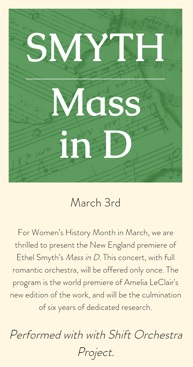 Capella Clausura invites you to a revolutionary and magnificent version of Mass in D by Dame Ethel Smyth. This new edition by Amelia LeClair with Shift Orchestra Project is presented for Women’s History Month in March at Emmanuel Church of Boston. This concert, with a full romantic orchestra, will be offered only once. The program is the world premiere of Amelia LeClair’s new edition of the work and will be the culmination of six years of dedicated research.