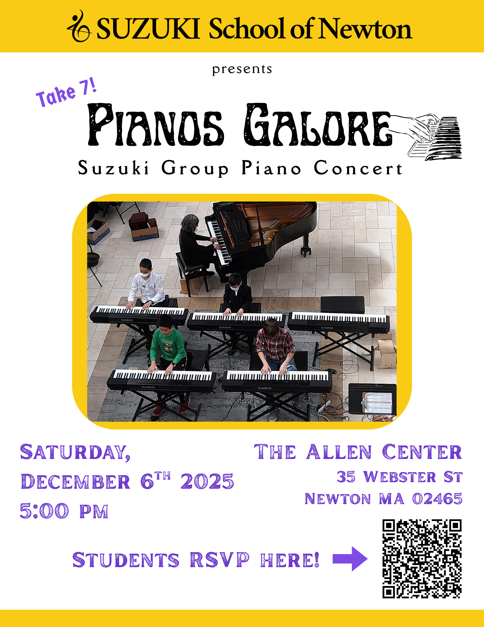 Event: Pianos Galore Description: Suzuki School of Newton piano students performing classical repertoire Saturday, Dec. 6th, 5-6:30 PM The Allen Center 35 Webster St. Newton, MA 02465 free event