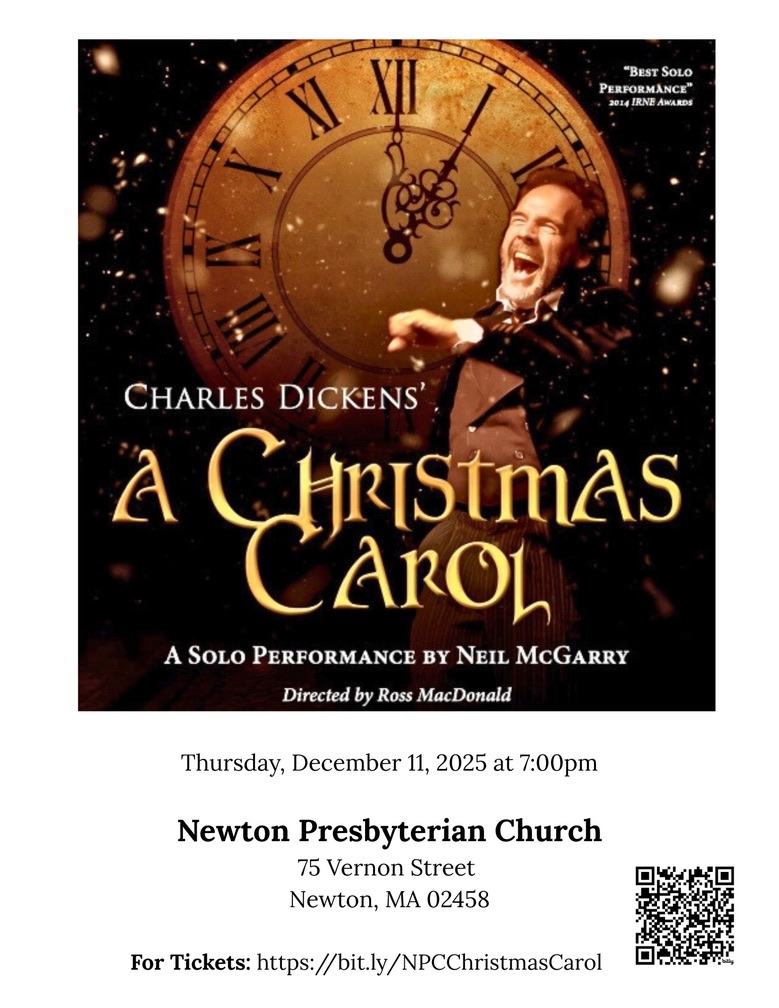 Neil McGarry returns to Newton Presbyterian Church for his 12th season performing "A Christmas Carol." Join us this holiday season in exploring Charles Dickens' immortal classic. A tale of tragedy, of ghosts, of the audacity of hope and the true spirit of Christmas. This one-man tour de force is an IRNE-award-winning performance, and not to…
