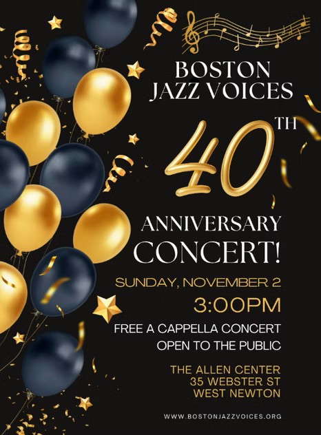Join Boston Jazz Voices as we celebrate 40 years of making beautiful music together. The group was founded in 1985 by a bunch of barbershoppers looking to expand their musicianship by singing the great arrangements of Gene Puerling, The Singers Unlimited, and The Hi-Los. This concert will include songs from each decade of our history.…