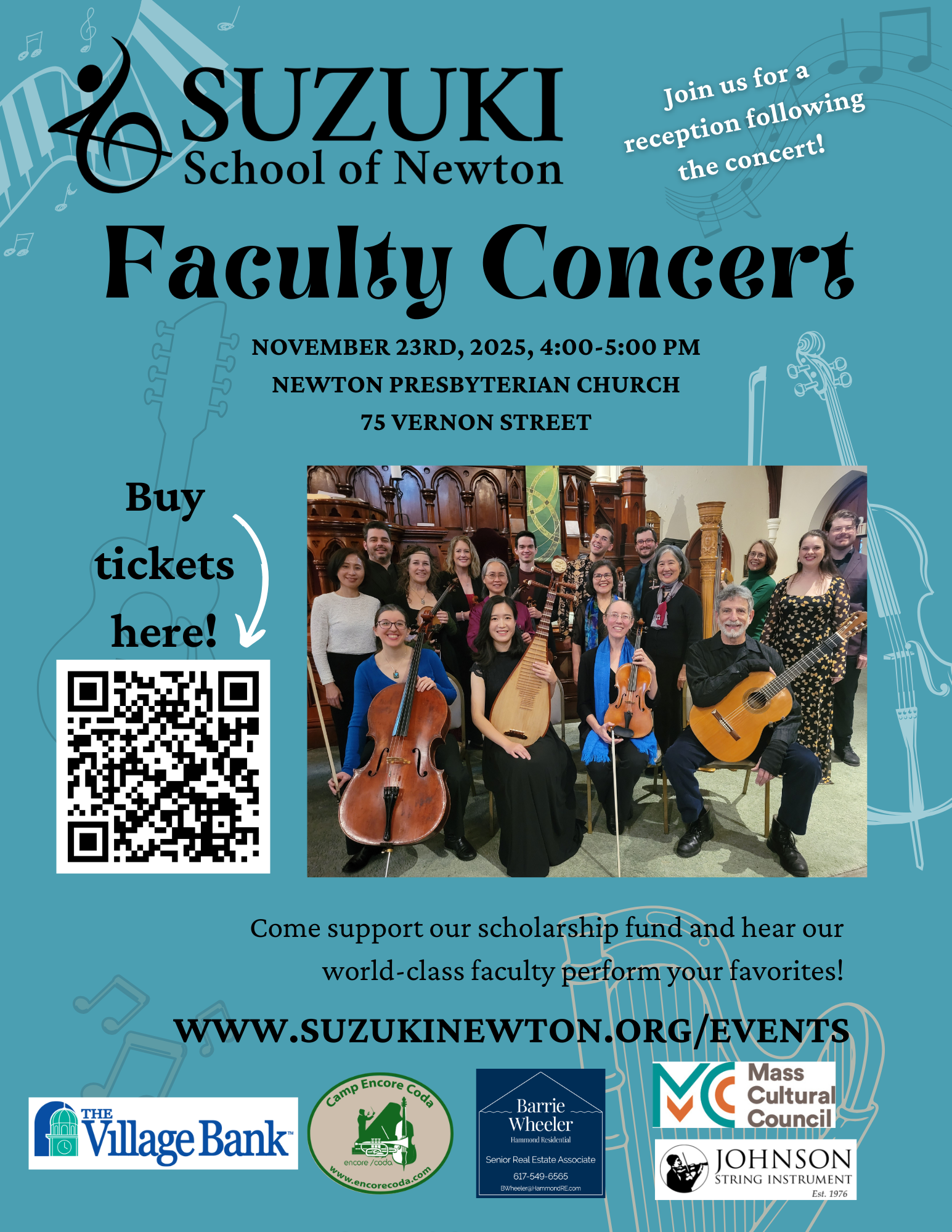 Event: Suzuki School of Newton Faculty Recital Description: Faculty performing classical favorites! Sunday, Nov. 23rd, 4-5 PM Newton Presbyterian Church 75 Vernon St. Newton, MA 02458 Tickets: https://www.zeffy.com/en-US/ticketing/ssn-faculty-concert