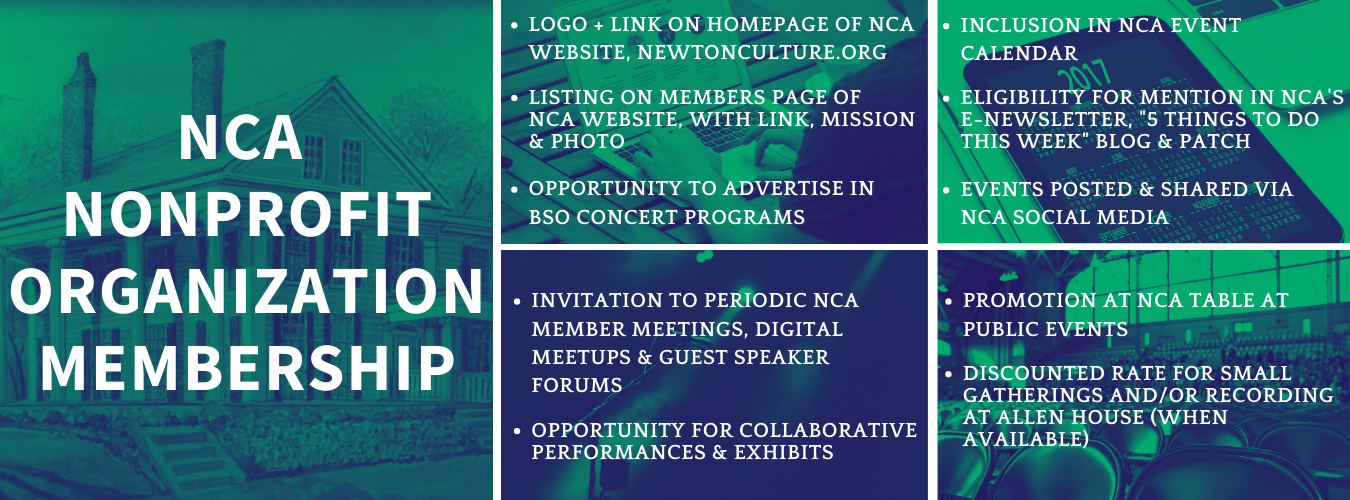 *Terms of Membership: NCA operates on a July 1 fiscal year and memberships are renewable on this date annually. All benefits are subject to change. Need more information? Contact NCA at operations@newtonculture.org.