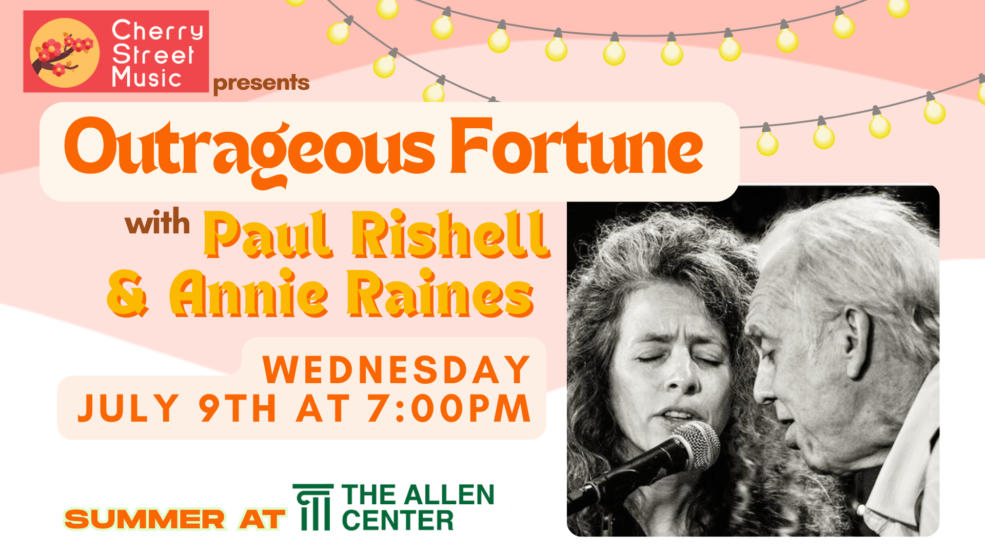 The Allen Center 35 Webster St, WEST NEWTON, MA, United StatesCherry Street Music presents the first in a dynamic series of summer gatherings on The Allen Center patio* on Wednesday, July 9th at 7pm. Join us for a thrilling concert with the Outrageous Fortune jug band, featuring renowned Blues duo Paul Rishell & Annie Raines. Enjoy a fun, relaxing evening at The Allen Center, West Newton's community hub for Arts &…