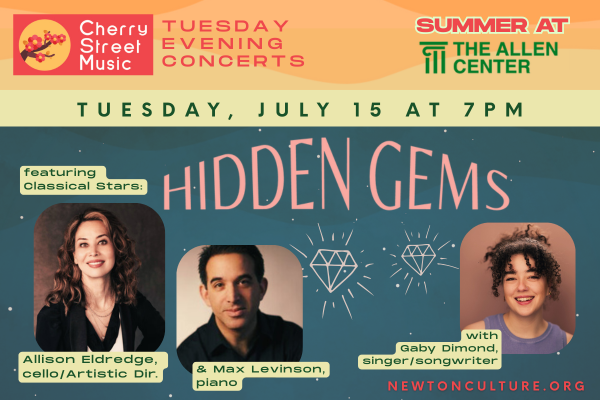 The Allen Center 35 Webster St, WEST NEWTON, MA, United StatesCherry Street Music is heating things up this summer at The Allen Center with fun, affordable concerts every Tuesday night, beginning July 15th at 7pm with "Hidden Gems". Discover the music of lesser-known female composers in a unique concert experience, which will take place in The Allen Center's intimate performance space, the Great Hall. Explore each composition with commentary by Cherry…