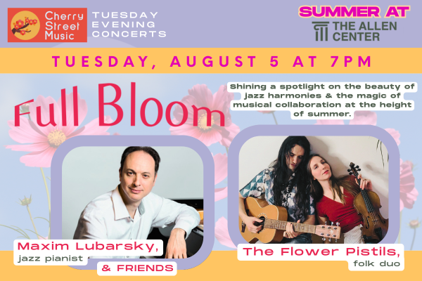 The Allen Center 35 Webster St, WEST NEWTON, MA, United StatesIn this fourth installment of Cherry Street Music's Tuesday evening Concert series at The Allen Center, we shine a spotlight on the beauty of jazz harmonies & the magic of musical collaboration at the height of summer, when everything is in "Full Bloom." Join us for an enchanting evening of performances featuring renowned pianist, Maxim Lubarsky (& friends- John Lockwood, bass & Bertram…
