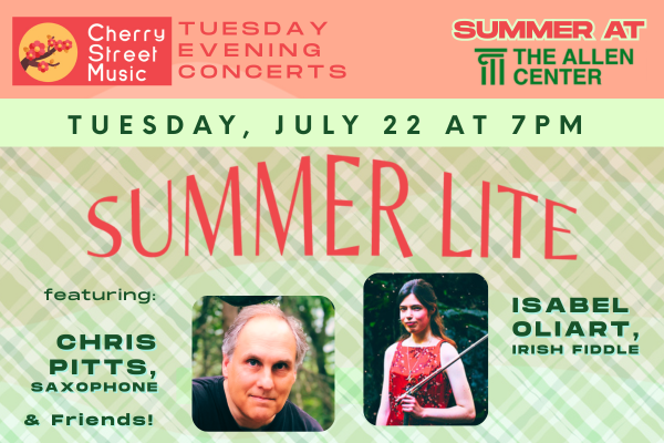 The Allen Center 35 Webster St, WEST NEWTON, MA, United StatesCherry Street Music is turning up the heat this summer at The Allen Center with enjoyable, budget-friendly concerts every Tuesday evening, continuing July 22nd at 7pm with "Summer Lite." Experience Irish music by Fiddler Isabel Oliart, along with Jazz Quartet, Chris Pitts and Friends, in The Allen Center's cozy performance venue. Join us for an exceptional blend of Newton artists…