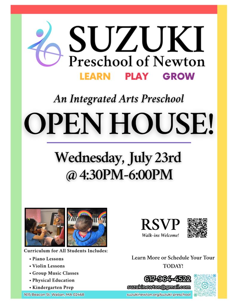 Join Us for a Suzuki Preschool Open House! 🗓️ Wednesday, July 23rd, 2025 ⏰ 4:30–6:00 PM 📍 Suzuki Preschool of Newton | 1615 Beacon St, Waban, MA Come explore the…