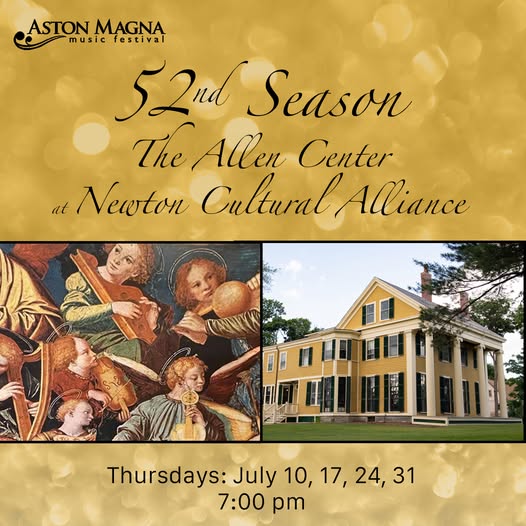 The Allen Center 35 Webster St, WEST NEWTON, MA, United StatesAston Magna Music Festival 52nd SEASON! Daniel Stepner, Artistic Director July 10 – August 3, 2025 Thursdays: July 10, 17, 24, 31 Allen Center at Newton Cultural Alliance 7:00 pm Program 1: Thursday, July 10, and Saturday, July 12 Music from Thomas Jefferson’s Library Geminiani, Balbastre, Arne, Purcell, Mozart, Weber Sylvia Berry, harpsichord and fortepiano;…
