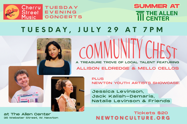 The Allen Center 35 Webster St, WEST NEWTON, MA, United StatesCSM Summer Evening Concert Series: The Tuesday Evening Music Series by Cherry Street Music continues with Community Chest on July 29th at 7pm. We've got a treasure trove of local talent coming to The Allen Center. Energetic music by Newton Youth Artists, including Jessica Levinson and Jack Kalish-Demaris, Allison Eldredge with the Mello Cellos, and Natalie Levinson on vocals. This will be…