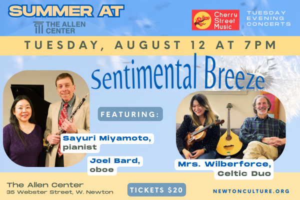 The Allen Center 35 Webster St, WEST NEWTON, MA, United StatesIn this final installment of Cherry Street Music's Tuesday Evening Summer Series at The Allen Center, we're bringing you a very special, very breezy concert, featuring a mid-summer mix of Classical music & Folk-inspired Celtic tunes to get you feelin' fine! Join us Tuesday, August 12th at 7pm for "Sentimental Breeze" with Sayuri Miyamoto, piano, Joel Bard, oboe, and…